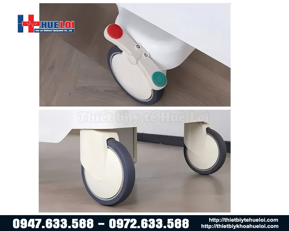 Khung giường chắc chắn, có tay vịn an toàn và hệ thống bánh xe linh hoạt, dễ di chuyển.