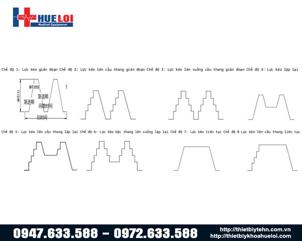 + Chế độ kéo ngắt quãng: có thể lựa chọn 8 chương trình kéo giãn được cài đặt sẵn, lưu ý với 8 chương trình này áp dụng cho kéo giãn cột sống lưng và lực kéo trên 300N