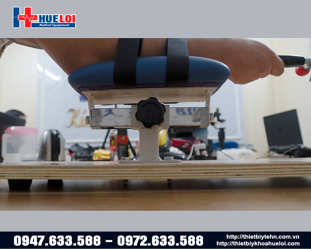 - Đặt cẳng tay lên đế đệm và cố định lại bằng 2 đai cố định đã thiết kế sẵn, điều chỉnh vị trí tay cầm và trở lực cho phù hợp, sau đó tiến hành tập luyện.